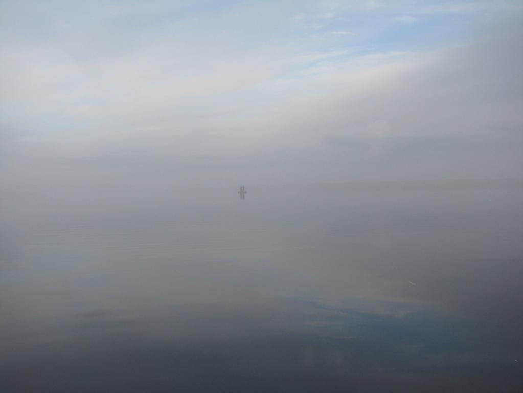 Погода сказочная - штиль и густой туман. Отойдя около 20м от берега совсем пропали в тумане. Остановил лодку что бы собрать спининг. Покопошившись немного со снастями озираюсь по сторонам. А куда идти? Вокруг всё белым-бело. Рядом слышны разговоры соседней лодки. Совсем рядом. Включил жопсик и потихоньку пошли на свои места.