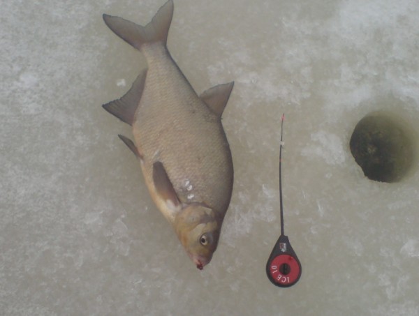ну не всё так плохо у меня с мормышками значит.Методом бурения и проб обнаружил свал в знакомую яму,замедлил игру и вскоре первый подлещик грамм300 всего вымолил у меня свободу.Тут же ,едва опустив,бздынь