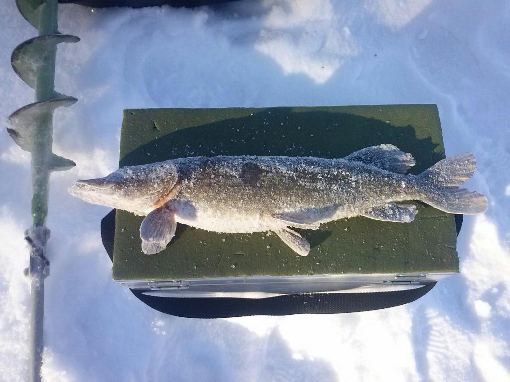 – собрались с товарищем – разбурили очередной плацдарм – попили чайку ,подкрепились и вперед – за щукой. На 3-й лунке получаю приятный удар – рыбка на том конце заходила подо льдом – держу, пытаюсь завести в лунку – есть ! килошная щучка. Минут через 10 на соседней лунке снова удар и щучка чуть поменьше первой уже на льду. Продолжаем рыбачить – щелк – поворачиваю голову на звук и вижу, как мой товарищ борется с кем-то. Подбегаю с крюком – но уже не надо – щука 1.650 уже на льду – правда удочку сломала зубастая.Ну на этом клев и закончился – погуляли мы еще по озеру – посверлили лунок – но более никто не позарился на наши приманки.