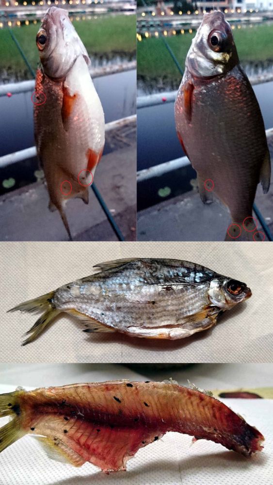 В последние годы области распространения многих заболеваний рыб расширяются. Связано это как с ухудшением экологической обстановки, что ведет к снижению общей сопротивляемости рыб болезням, так и с изменением границ ареалов различных животных-переносчиков заболеваний. Черные точки на теле рыб, насколько можно судить по имеющимся описаниям обеспокоенных рыболовов, - это признак как раз одного из таких заболеваний. Это - постодиплостомоз. Вызывается он личинками паразитического червя Postodiplostomum cuticola из класса дигенетических сосальщиков. Взрослый червь имеет плоское тело длиной 1,5 мм и шириной 0,5-0,9 мм, но он сам к появлению черных точек прямого отношения не имеет. Он паразитирует в кишечнике рыбоядных птиц, таких как квакши или цапли. В кишечнике птицы черви продуцируют яйца, из которых выходят личинки. Личинки попадают в воду и проникают в тело промежуточных хозяев - моллюсков. В моллюске происходит бесполое размножение личинок, в результате которого получаются снова личинки, но уже другого строения - церкарии. Вот они-то и паразитируют на рыбах. Откуда же берутся черные точки? Церкарии выходят в воду и внедряются под кожу и в мышцы рыб. При этом в подкожной клетчатке рыбы на глубине в 1,5-2 мм вокруг личинки образуется соединительнотканная капсула, в которой откладывается черный пигмент гемомеланин - продукт распада клеток крови и пигментных клеток кожи рыбы. Так и возникают "черные точки".