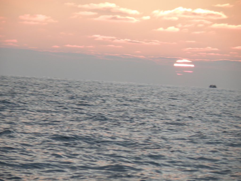 Дима выходит выводит лодку на глис и мы с Васей вновь судорожно цепляемся за лодочную оснастку и стискиваем зубы дабы их не потерять при тряске по волнам. Задницы хоть и сидят на балонах лодки, но это так только утрированно называеться, т.к. они только касаються балонов после высоченных подкидов на волнах и это опять же только для того, что бы получить очередной удар по заду как с носка ногой и в полную силу. Сопли текут и лаза слезяться от встречного ветра и даже полароиды довольно прилично закрывающие их, не спасают от встречного ветра.