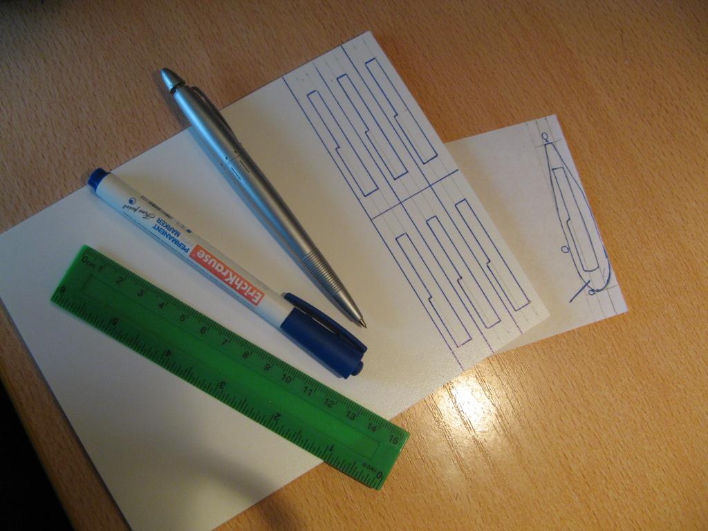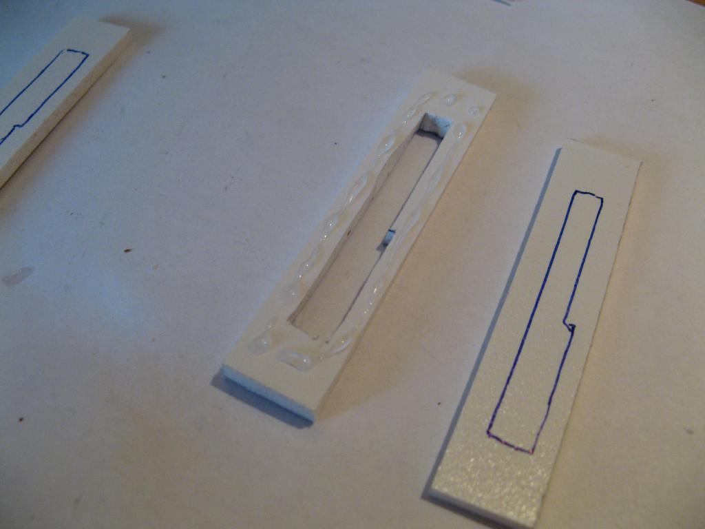 Итак, материал. Вспененный ПВХ листами. Начинаем с листа 5 мм, на котором размечаем бруски заготовок и внутренние полости: