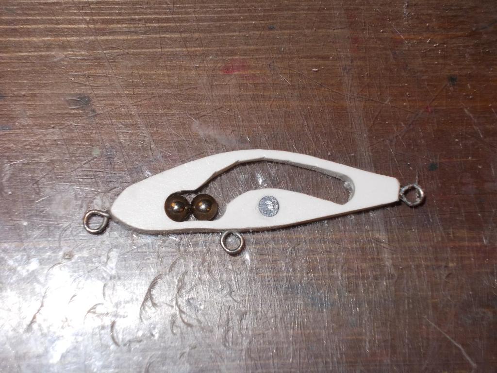 Один из вариантов размещения огрузки, при начале проводки шарики легко перекатываются в нос даже без рывков, а в воде сам воб расположен горизонтально, что желательно для не равномерной с остановками проводки. Свинцовый цилиндр доп.огрузки можно подбирать опытным путем до нужной плавучести записывая результаты на будущее.