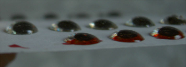 Теперь окончательная линзочка глаза. В данном случае она была сделана из эпоксидной смолы. Эпоксидка использовалась потому что считаю её самой доступной и рациональной. Считаю, что для такой процедуры следует использовать двухкомпонентные смеси потому что они практически не дают усадки, и как следствие не дадут морщин на конечном изделии. Так же, хорошая прогнозируемость высоты линзы ещё на стадии изготовления. Как следствие хорошая повторяемость изделий. Кончено же эпоксидка не без недостатков. Основной на мой взгляд, это воздушные пузыри. В последующих фотках пузыри получились во всей красе