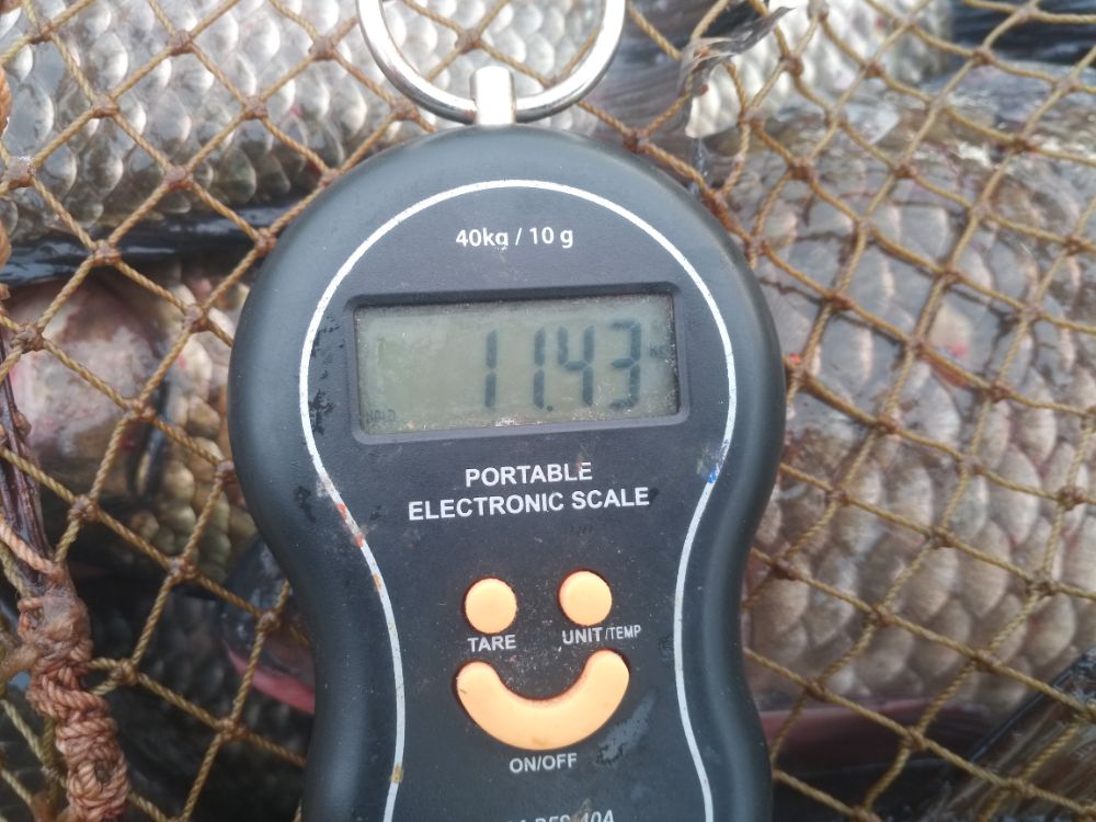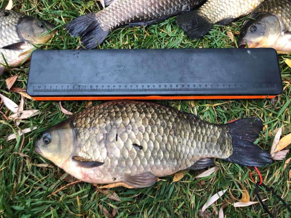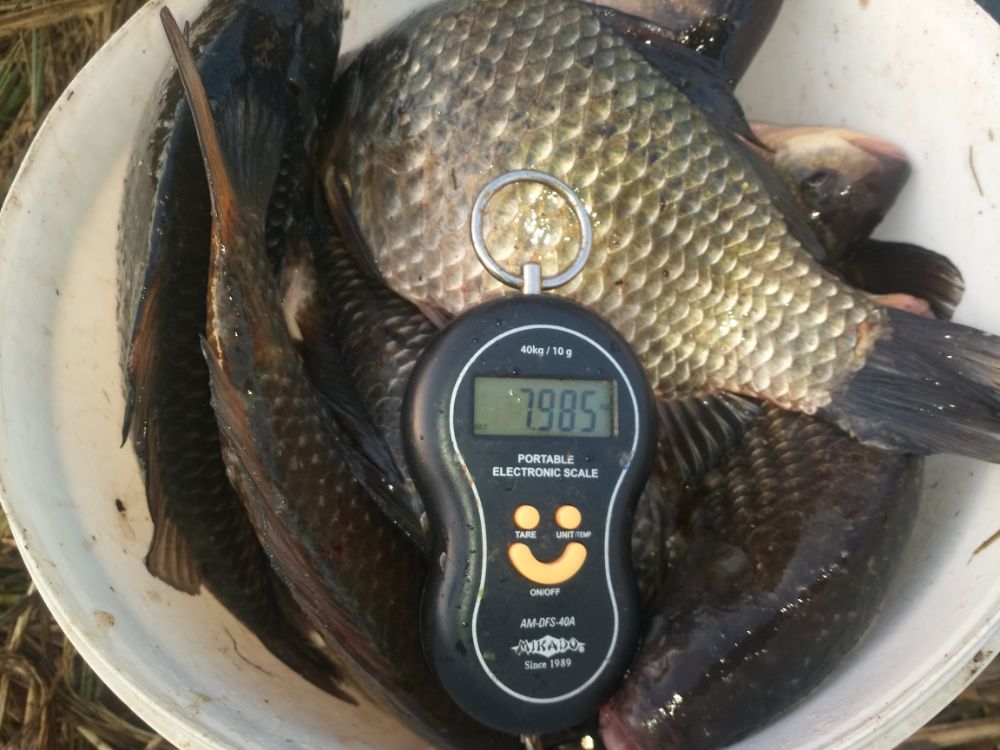 Итог рыбалки 9 рыб. Я взял 5 рыб. Заключительный карась наотрез отказывался лезть в подсак, яростно стартуя во все стороны. Вываживал долго. Это был самый большой экземпляр этого дня - 40см 1,6кг. Остальные тоже были закилошные и лишь один был докило.