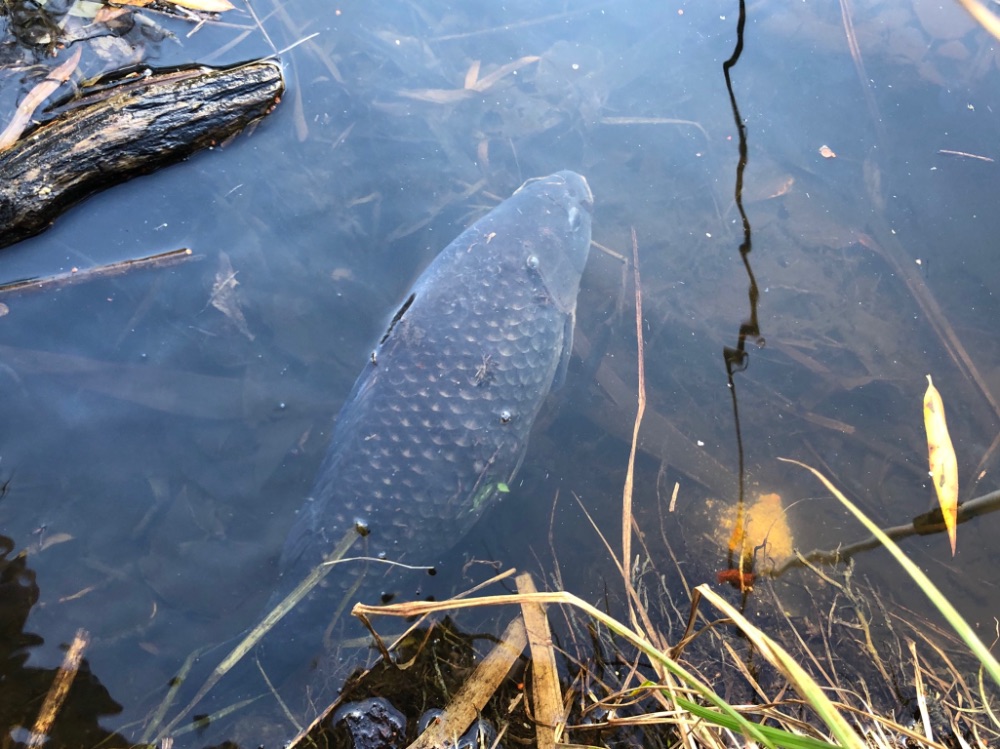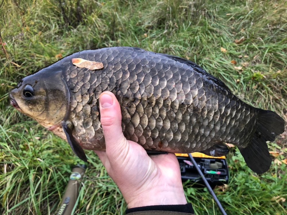 Карась клевал исправно, размер радовал. В этот раз забыл и садок и подсачек. Выводить приходилось под берег и брать рукой - всё на грани фола. Делал фото и сразу отпускал.