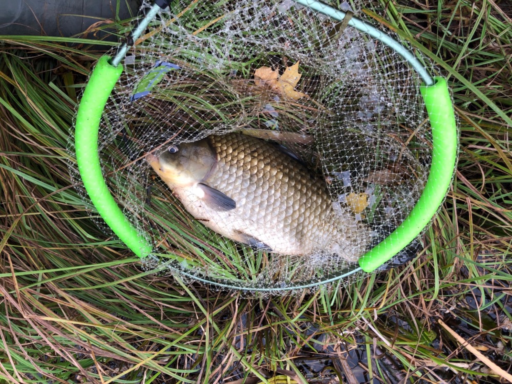Первая поклёвка в новой точке последовала в 15:00, спустя 3 часа после приезда. Виктор к этому времени уже успел обрыбится. Первый карась в подсаке! От нуля ушёл
