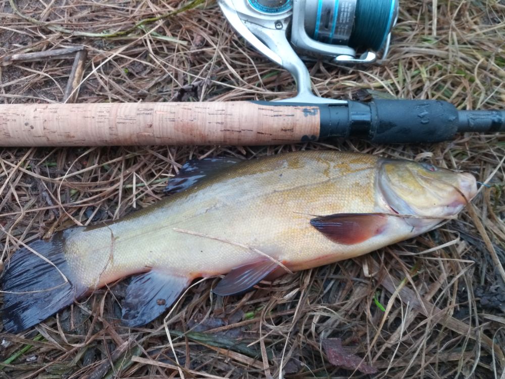 Бонусом влетел неплохой линь! Поклёвка злая, вываживал долго, но в итоге всё-таки вытянул его на берег.