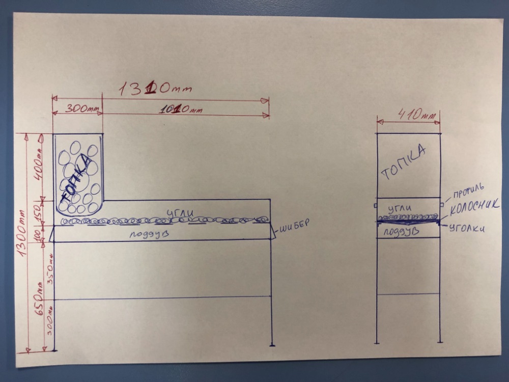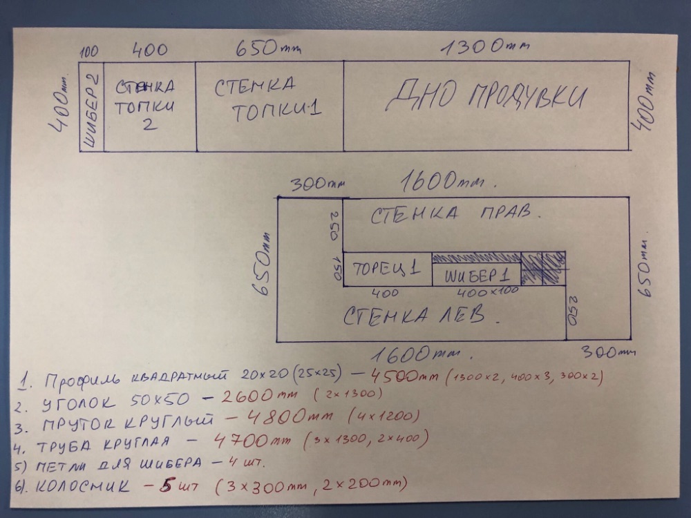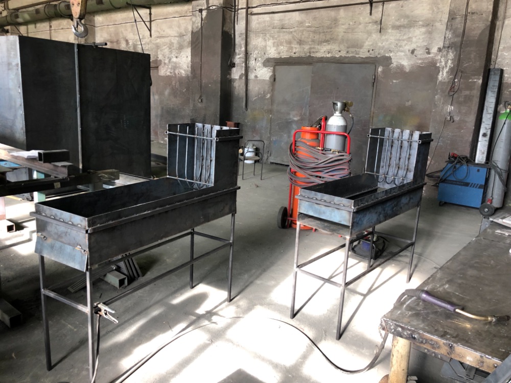 Собрал воедино информацию о вариантах и особенностях конструкции профессиональных мангалов и сделал чертёж мангала именно под свои нужды. Друг заказал на производстве необходимый нам металл, а я тем временем привёз из Питера чугунные колосники (обошлись там в более чем 3 раза дешевле). В прошлую пятницу выехали на производство и к вечеру 2 мангала - близнеца были готовы