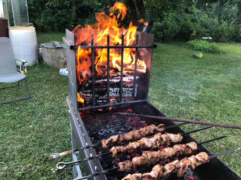 Тяга регулируется двумя шиберами по торцам. Чугунные колосники придают дополнительный мягкий жар на котором можно довести продукт даже в отсутствии углей. Само-собой слой углей при таких условиях значительно меньше чем в классическом мангале. Расход дров больше чем в стандартном мангале, но, учитывая что еда может готовится непрерывно, наверное то на то и выходит. Зола удаляется из поддона при помощи кочерги.