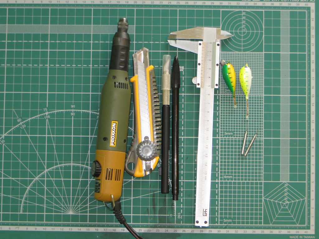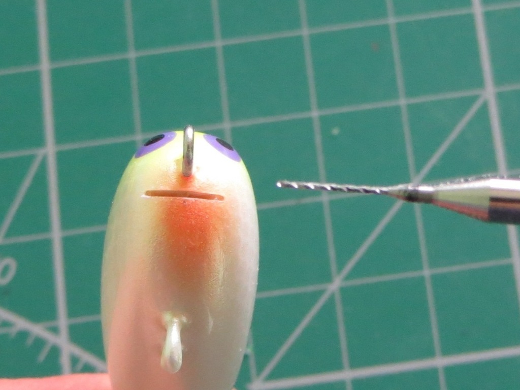 Способов установки лопатки воблера довольно много. На примере конкретной модели опишу, как эту операцию произвожу я. Итак, поехали. Берем нашу заготовку. По сути это уже готовый воблер, то есть уже покрашенный и отлакированный, но без лопасти. Сделан из бальзы - это важно. Зачищаем от лака переднюю петлю. Теперь нам нужно определить место врезки лопатки. Сделать это можно разными способами и с применением тех или иных инструментов и приспособлений. В моем конкретном случае нам понадобится штангенциркуль, капилярная ручка и канцелярский нож. Лопатка у меня сделана из стеклотекстолита. Часть ее спрячется в теле приманки. Поскольку лопатка находится на некотором удалении от передней петли, мне нужно определить место, где будет начало прорези. Выставляем нужное нам расстояние на штангеле и, подставив его губки для внутренних измерений к основанию передней петли, им же делаем риску на теле приманки. Теперь нужно разметить место самой прорези с учетом угла врезки. В этой модели я легко делаю это на глаз с помощью капилярной ручки. Чтобы не ошибиться, чтобы получилось без перекоса, разметку необходимо осмотреть с разных ракурсов. Хорошо бы еще взять воблер с уже сделанной прорезью и провести сравнения. Капилярная ручка стирается одним движением, поэтому нашу разметку всегда можно поправить. Да - не делайте разметку сразу во всю необходимую длину, оставьте запас. Теперь проходим лезвием канцелярского ножа по нашей разметке. Затем как бы стираем чернила ручки. Наш надрез будет хорошо виден - чернила слегка его окрасят. Подрезаем лаковое покрытие чуть ниже, расширяя нашу разметку. Далее нам понадобится бормашинка. Берем бормашинку и высверливаем лак вдоль разметки. Именно вдоль, а не втыкая сверло перпендикулярно ей. Для врезки лопаток толщиной 0,6мм я пользуюсь сверлом толщиной 0,45мм, что позволяет в случае небольших отклонений нашу прорезь слегка поправить-выровнять с помощью модельного ножа или обыкновенного канцелярского. Лаковое покрытие на правой стороне воблера я высверливаю, удерживая приманку хвостом к себе. На левой - хвостом от себя. Так проще контролировать рез. Далее прикладываем в определенном положении воблер к листку с нанесенными на него линиями и засверливаемся уже в бальзу под определенным углом в нескольких местах. Затем просто берем заготовкут в руку и, ориентируясь на то, что мы проделали ранее, производим уже полную выборку под нужным нам углом. При необходимости расширяем, удлиняем прорезь. Лучше это делать ножом. Пробуем вставить лопатку, сравнивая ее положение с линиями на листке, чтобы не уйти от необходимого угла. С помощью штангеля проверяем также длину рабочей части лопатки. Когда лопатка села, когда нас все устраивает на данном этапе, вытаскиваем лопатку и мелкой наждачкой слегка проходим по краям нашей прорези. Берем лак ЛВ-1. Он должен быть густым, но не таким, который при попытке взять его каплю проволочкой, начинает пускать длинные нити. Капля за каплей загоняем лак внутрь прорези и даем ему подсохнуть. Если вы вклеиваете сразу много лопаток, можно залить лак в прорезь шприцом - получится быстрее и лак в этом случае может быть гуще. Лопатку обезжириваем спиртом или чем-либо другим и, когда лак в прорези подсохнет, вставляем ее туда. В идеале лопатка должна заходить с усилием, а лак не должен вылезать нар