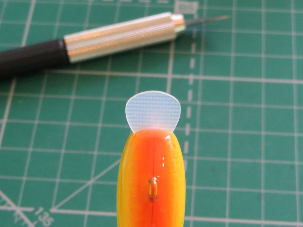 Способов установки лопатки воблера довольно много. На примере конкретной модели опишу, как эту операцию произвожу я. Итак, поехали. Берем нашу заготовку. По сути это уже готовый воблер, то есть уже покрашенный и отлакированный, но без лопасти. Сделан из бальзы - это важно. Зачищаем от лака переднюю петлю. Теперь нам нужно определить место врезки лопатки. Сделать это можно разными способами и с применением тех или иных инструментов и приспособлений. В моем конкретном случае нам понадобится штангенциркуль, капилярная ручка и канцелярский нож. Лопатка у меня сделана из стеклотекстолита. Часть ее спрячется в теле приманки. Поскольку лопатка находится на некотором удалении от передней петли, мне нужно определить место, где будет начало прорези. Выставляем нужное нам расстояние на штангеле и, подставив его губки для внутренних измерений к основанию передней петли, им же делаем риску на теле приманки. Теперь нужно разметить место самой прорези с учетом угла врезки. В этой модели я легко делаю это на глаз с помощью капилярной ручки. Чтобы не ошибиться, чтобы получилось без перекоса, разметку необходимо осмотреть с разных ракурсов. Хорошо бы еще взять воблер с уже сделанной прорезью и провести сравнения. Капилярная ручка стирается одним движением, поэтому нашу разметку всегда можно поправить. Да - не делайте разметку сразу во всю необходимую длину, оставьте запас. Теперь проходим лезвием канцелярского ножа по нашей разметке. Затем как бы стираем чернила ручки. Наш надрез будет хорошо виден - чернила слегка его окрасят. Подрезаем лаковое покрытие чуть ниже, расширяя нашу разметку. Далее нам понадобится бормашинка. Берем бормашинку и высверливаем лак вдоль разметки. Именно вдоль, а не втыкая сверло перпендикулярно ей. Для врезки лопаток толщиной 0,6мм я пользуюсь сверлом толщиной 0,45мм, что позволяет в случае небольших отклонений нашу прорезь слегка поправить-выровнять с помощью модельного ножа или обыкновенного канцелярского. Лаковое покрытие на правой стороне воблера я высверливаю, удерживая приманку хвостом к себе. На левой - хвостом от себя. Так проще контролировать рез. Далее прикладываем в определенном положении воблер к листку с нанесенными на него линиями и засверливаемся уже в бальзу под определенным углом в нескольких местах. Затем просто берем заготовкут в руку и, ориентируясь на то, что мы проделали ранее, производим уже полную выборку под нужным нам углом. При необходимости расширяем, удлиняем прорезь. Лучше это делать ножом. Пробуем вставить лопатку, сравнивая ее положение с линиями на листке, чтобы не уйти от необходимого угла. С помощью штангеля проверяем также длину рабочей части лопатки. Когда лопатка села, когда нас все устраивает на данном этапе, вытаскиваем лопатку и мелкой наждачкой слегка проходим по краям нашей прорези. Берем лак ЛВ-1. Он должен быть густым, но не таким, который при попытке взять его каплю проволочкой, начинает пускать длинные нити. Капля за каплей загоняем лак внутрь прорези и даем ему подсохнуть. Если вы вклеиваете сразу много лопаток, можно залить лак в прорезь шприцом - получится быстрее и лак в этом случае может быть гуще. Лопатку обезжириваем спиртом или чем-либо другим и, когда лак в прорези подсохнет, вставляем ее туда. В идеале лопатка должна заходить с усилием, а лак не должен вылезать нар