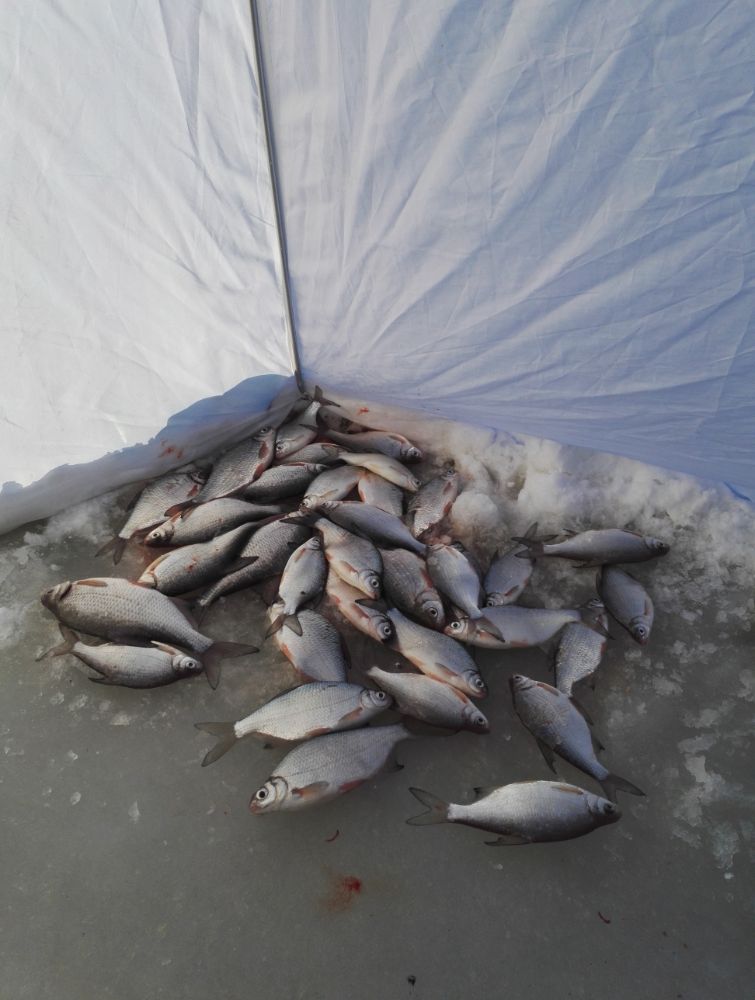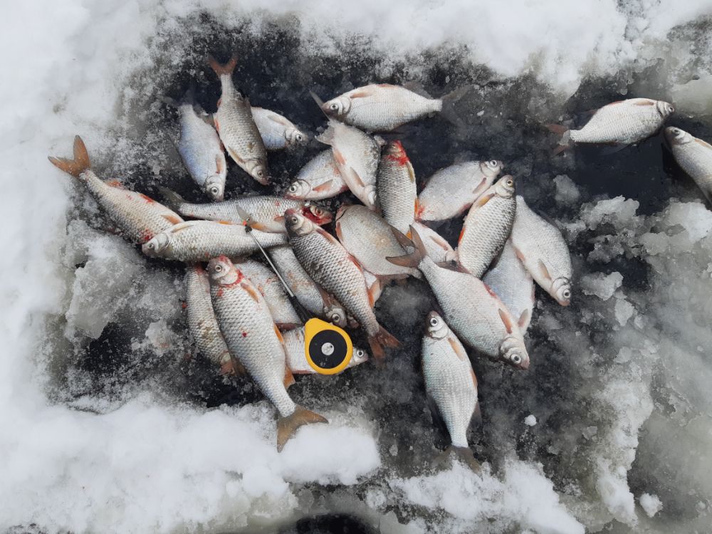 Посетли сегодня речку у бочки, приехали в самый рассвет, машин 15 уже стояло, планируемое место было занято, прошли выше и засверлились от берега к середине, прикормили, из 5 лунок заработала одна мелкими густероидами. Просверлили выше и ниже, тишина. План сесть в палатке был сразу отвергнут, а тут ещё одна лунка начала стрелять неплохо плотвой, так и пробегали по лункам до 14 часов,на удивление работали практически первые лунки, иногда прикормка отпугивала, рыб на неё не вставал, на удивление густера нас тоже не очень жаловала, у меня штук шесть и у Паши с 4 десятка, забрали только три покрупнее, родичам на сковородку. В прилове два хороших ельца, один вимбас мелкий проскачил и с десяток колюх в одной лунке, остальное плотва - цель рыбалки.