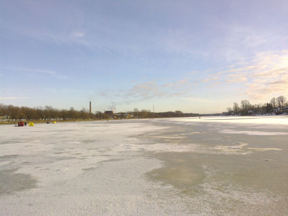 Тут и спасатели подоспели, но они то лёд проверять. Снарядили одного, в костюм. И с буром на лёд. Сами верёвку разматывают. Поговорили, говорят под Рижским мостом сантимов 10. Вчера вроде народ сидел. Тут, у бочки, получилось у них 7-8 см. Говорят можете идти, но осторожно. И про наличие верёвок интересуются. Решили не суваться, тем более то там, то тут некрасивые мокрые пятно присутствуют. Проехали к мосту. Там ни кого. Вернулись на полпути обратно, там были замечены 4 машины и народ на льду. Ну пошли. На льду снег. встали наугад. ЯТЬ. 3-4 ОБОРОТА БУРА И ЛУНКА ГОТОВА.
