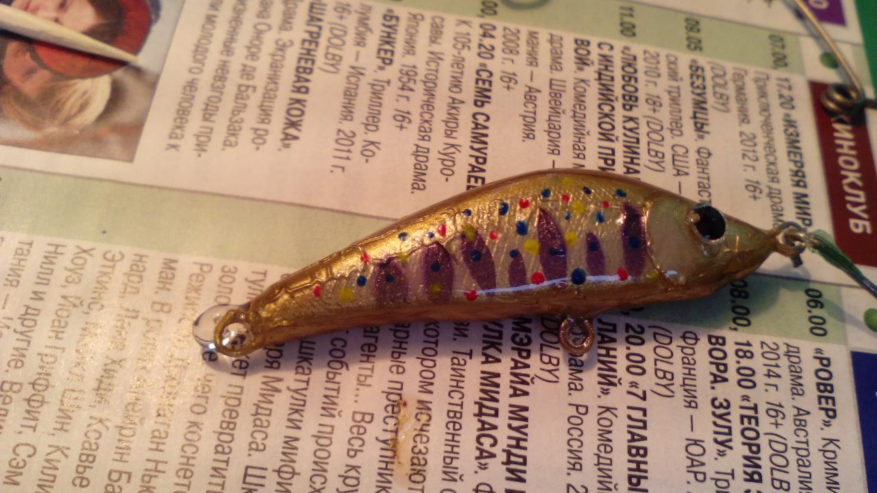 Да все именно так.BrodygaSPb писал(а): если я правильно понимаю, на воблерке есть пропитка/несколько слоёв пропионата/нанесён базовый цвет Креатексом и одно окунание в КАБ-лак???