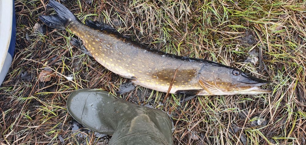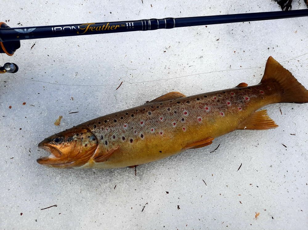 Из трех прикормленых лунок одна нолёво молчала. Хоть жерлички стояли немного по одаль, одну поставил на прикормленное место, ну не нравилось мне это молчание.... Буквально через 20мин, сидя на соседней лунке, флаг взлетел на глазах. А я знаю тамошний рельеф, пусть крутит, кроме травы цеплятся не за что. Не торопился.