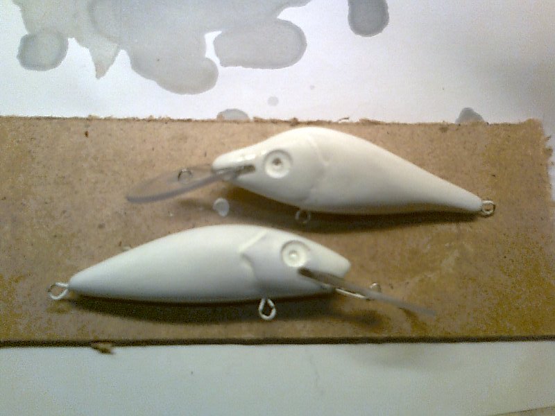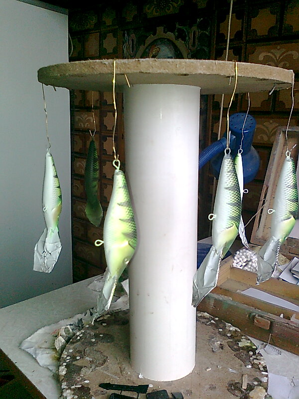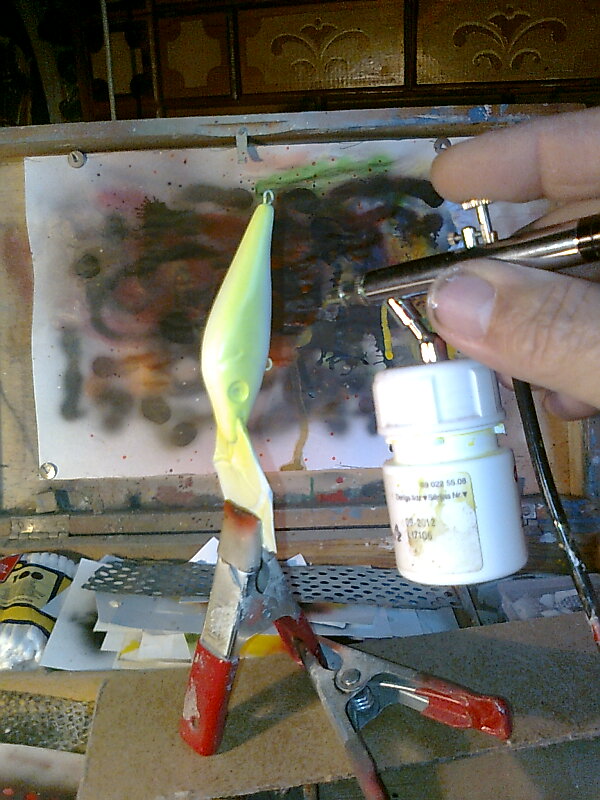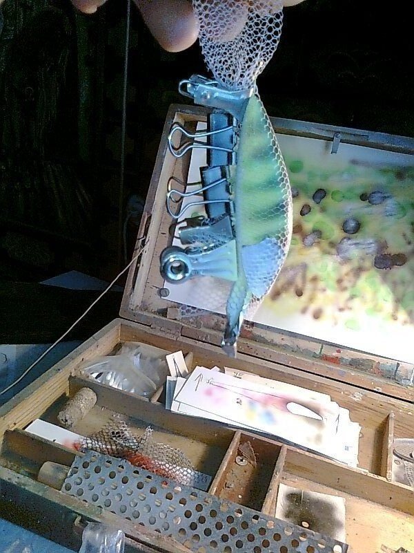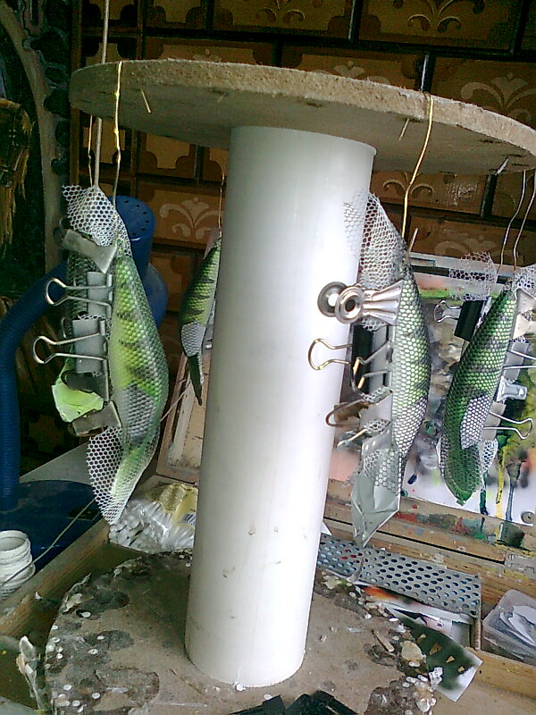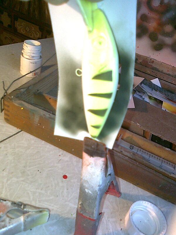 Продолжаем красить наших вокуней... жаберные крышки закрываем бумажкой, чешую красим двумя красками : тёмным цветом к голове, светлым к хвосту,( это обязательно)в нашем случае чёрным и золотистым, красить под очень острым углом... направлять поток краски почти параллельно воблеру...не переборщите, когда красиш почти незаметно