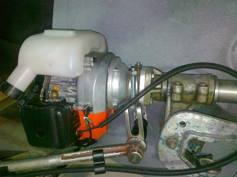 Столкнувшись с такой ситуёвиной,я и решил пришпандорить мотор от триммера на ногу Ветерка. Идея,конечно,не нова,но привлекает простотой и дешевизной. Воздушное охлаждение (помпу вон), глушак и бачок (прим.2л.) на моторе.