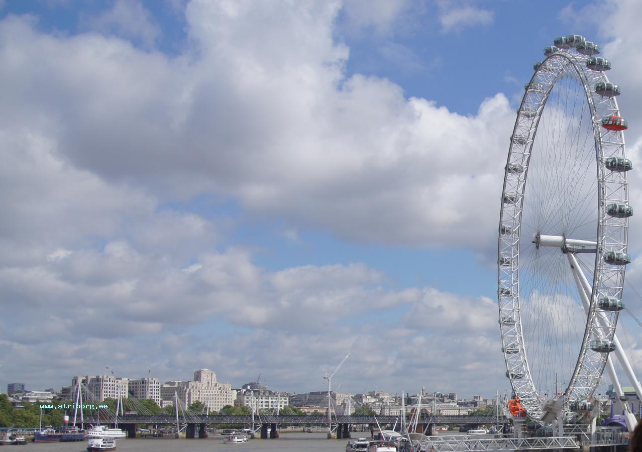 Колесо обозрения в центре города на берегу Тэмзы, построеное по прототипу обычного велосипедного колеса с креплением обечайки на спицах
