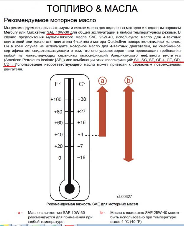 Руководство http://velhod.ru/manual/Merc_4s_30-40EFI.zip" onclick="window.open(this.href);return false; Вам отлично подойдет автомобильное масло 10W30 от хорошего производителя, с маркировкой на соответствие одному из стандартов приведенных ниже. Термостат находится справа по ходу в самом верху. Маленкая крышка. ИМО, исходя из вашего описания проблемы он не может быть причиной. Если термостат не открывается, то через заметный промежуток рвемени работы на больших оборотах сработает защита. Если термостат всегда открыт мотор не будет набирать нужную температуру, но защита срабатывать не будет. Еще раз, код вашей ошибки вызывается двумя причинами - перегрев мотора или низкое давление масла.