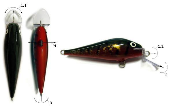 Некоторые модели воблеров Murto имеют вклеенную лопасть с небольшим наклоном для достижения нарушения их действия. The wrist действие означает что воблер качается (поворачивается?) боком (в стороны) так, что показывает его фланги. The wrist действие может быть получено, поворачивая петлю крюка живота в бок (4).