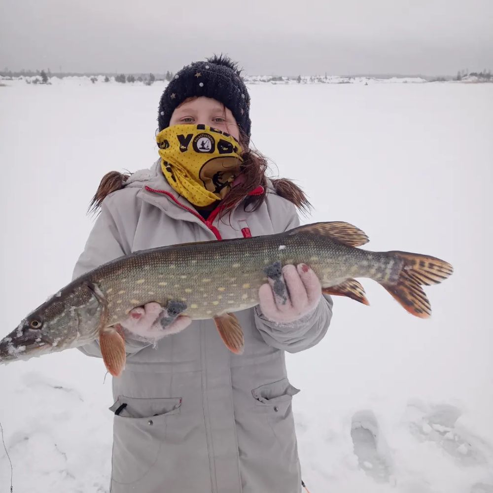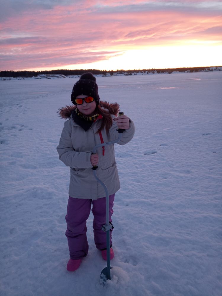 Тем не менее, настроение не упало,через полчаса примерно опять подъём с соседней лунки.На этот раз даю дочке все полномочия,в том числе и подсечку.Засекла,тащит,говорит, тяжеловато идёт,ну, думаю, килошка какая...Но увидел под лункой рыбу и охренел...Леска начала звенеть,рыба рвётся вниз...Не рви,отпускай сквозь пальцы,дай погулять ей, аккуратнее поднимай...это я стою рядом и пихаю Ульяне свои нравоучения