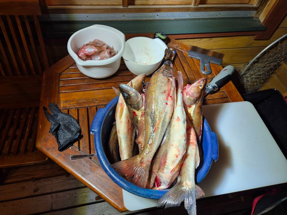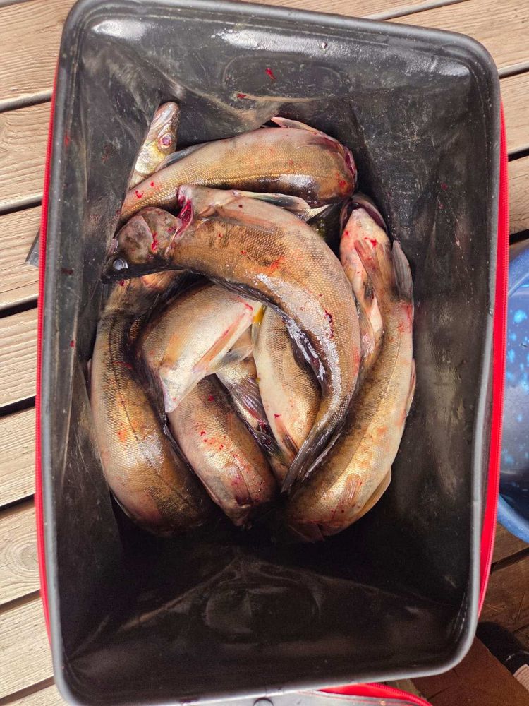 Сегодня поймали 10 штучек. В одном месте попали на выход судака. Выход был 20 минут. За это время с собой взяли 5 штучек и несколько недомерок отправили домой. Потом клёв кончился.