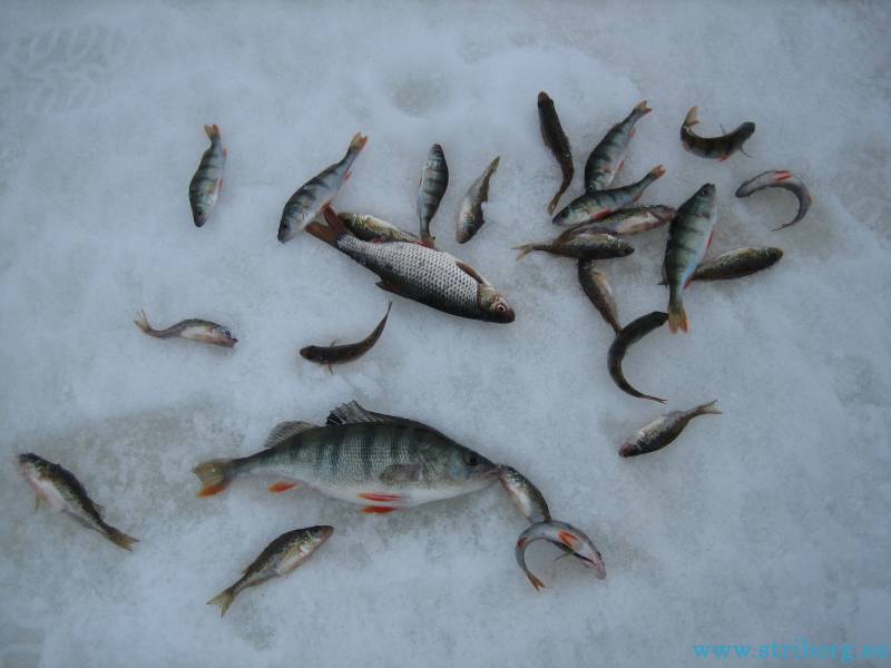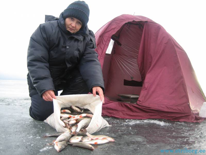 Ну вот, думаю, уже не зря ходил. Опускаю, опять поклёвка сразу, душа в ожидании чего-то хорошего — опа ёрш, но крупненький. Без особой надежды размотал таки удочку с белой мормышкой, где сидел мотыль с опарышем. Почти сразу кивок ожил — есть кто-то хороший, крупненькая плотва. И понеслось, донку пришлось вытянуть, что бы не мешала. Только мормышка, глубина 5 м, не успевал опускать, мгновенные поклёвки. Мотыля перестал надевать, быстро сжирали, зато несколько опарышей долго держались, а клёв такой же. Сначало складывал в пакет, потом перестал, некогда, вокруг ни души, ближайший рыбак в 500 м. Потом резко усилился ветер, потом вообще ураганный и переменился с юго-западного на юго-восточный. Клёв стал стихать. Ну вобщем 3 часа удовольствия я получил, кил 6 где-то за это время, в 17 пошёл за напарницей. Там в палатке было спокойно по клёву, но зато она оборвала донку, таща кого-то здорового, может леща, но леску оборвать 0,18 у поплавка неслабо. И ещё переменившийся ветер чуть не унёс палатку.