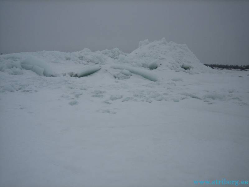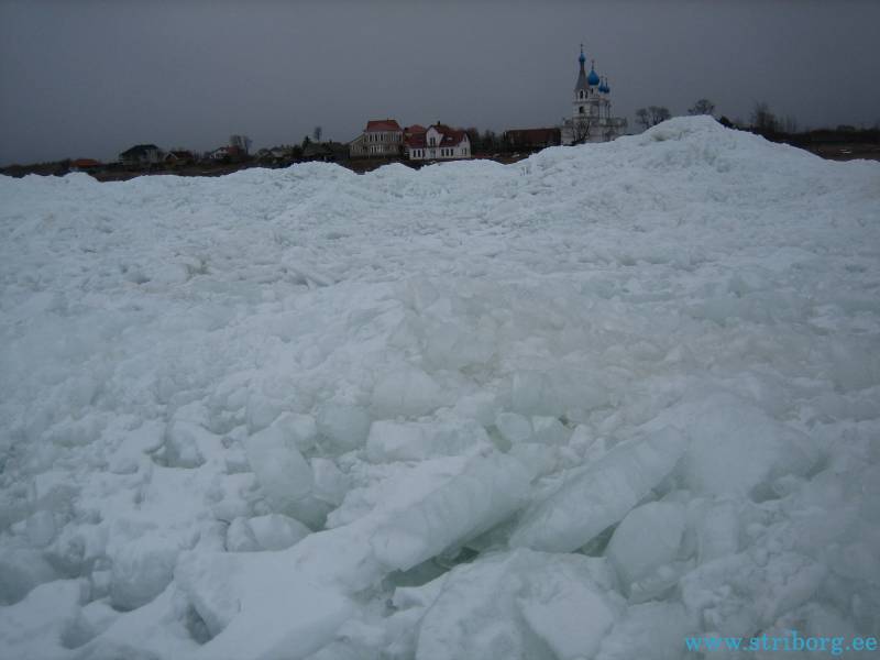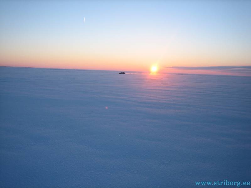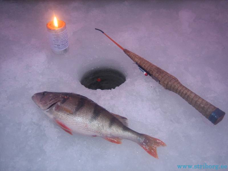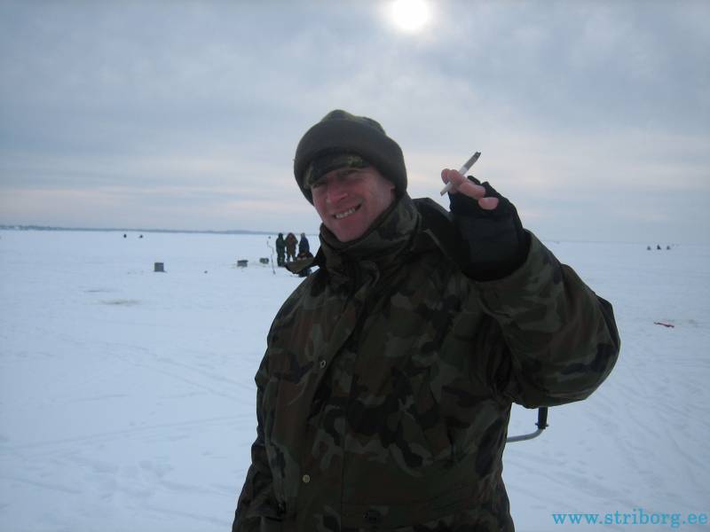 Ещё через два часа меня это достало и я ушёл в свободное плаванье. Ушёл в озеро дальше всех, до горизонта никого, причём это было всего в 4 км от берега. Кстати видно было эстонский берег или мираж?Если в Спицыно на этом растоянии народ кишмя кишел, то в Ветвеннике тишина, все караулят у берега. Вобщем глаз зацепился за какой-то торосик, дошёл до него и сел. Опустил любимую донку, пока разматывал мормышку, поплавок ушёл — достаю окуня на 400г.