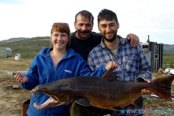 На след. день на реку пошли Паша, Игорь, Сергей и я, но не сразу, пришлось переждать дождь. На реке встретили ребят Москвичей, которые несли 2 сёмги 6,5 и 4,8 кг(молодцы, им дождик не почём и на реке они были первыми). На реке видели одну сёмгу- прыгала много раз, но не брала- колотая, видать подошла рыбка, закончилось опять сигом, харьком, кумжой, форелью... Выспались, и поехали домой, так сказать от рыбы, но было пора...