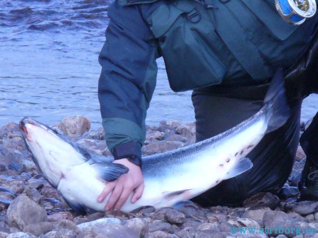 Длина 2,1, тест 0,6-7 грамм, катушка того же ручья, какая то вообще пластмассовая, плетенка Гессен 0,08мм, нахлыстовая застежечка, блесна Мюран Тони 7 грамм. Забрасываю в надежде поймать хариуса – бац – удар – оба на… на ультралайт садится семга на 2,5 кило… вот Мать её… визжит фрикцион, гнется в дугу спиннинг, я подматываю к себе, семга тащит в воду, 10 или 15 минут перетягивания, я наадреналинился по самое не могу, снасть держит, все грамотно отрегулировано, катушка просто горячая, но семга начинает сдаваться и я вытаскиваю её на берег. Лешка, из нахлыстовиков, успел схватить мой фотик и включив режим видео весь процесс снимал, правда, уже последние 3-5 минут, но – все равно, процесс вываживания был заснят. Я отхаживаю и отпускаю семгу.