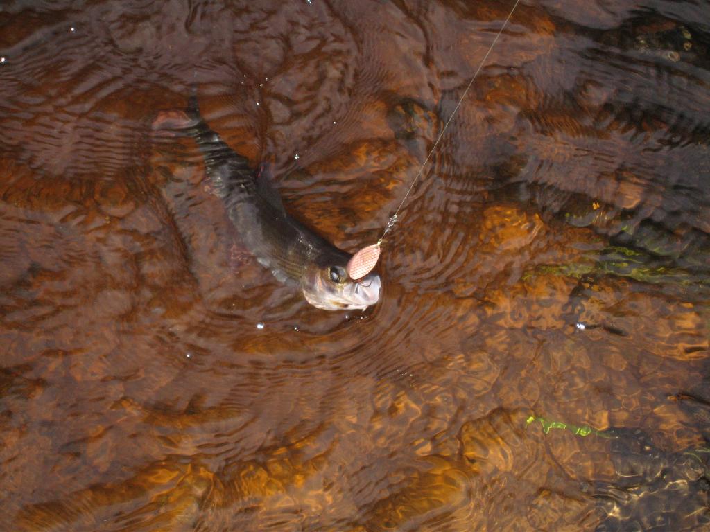 Но да ладно - проверим, кто тут есть. Заброс - выходит "торпеда". Я, честно признаюсь, сначала подумал, что это кумжа, но потом вспомнил, что кумжи здесь быть не может. "Торпеда" проследовала за моим воблером и ушла на свою боевую позицию в самом конце проводки.
