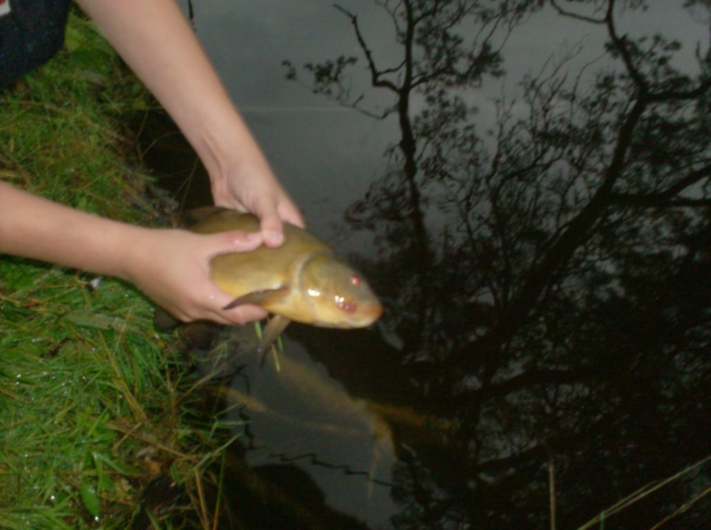 Всем,приветик. ...Наступило лето...пляжная пора заглянула в наши края.Ну и естественно меня тут же запрягла ребятня в извозчики.И вот на одном из лесных озёр,суббота-воскресенье,я и с ними искупаюсь и в сторонке с махом постою.Верхний слой воды прогрелся,а поглубже холодком обжигает.Ну и веры особо нету,немного постою,слегонца подкормив,так ничего интересного,удерживает:а вдруг.Случаи бывали.Ну и сегодня после работы,едем,я ворчу всю дорогу:Куда едем,тучи кругом?Но если им чего втемяшилось не переубедить.Тока значится подьехали,и заморосило.Те в воду попрыгали хоть бы чё,а я стою на бережку неспешно,но уверенно так мокну.В стороне грохочет,грохотало и вчера,но дождь прошол мимо в пару километрах,сегодня попало.Но каплет не так чтоб очень,терпимо.Прикорм не стала переводить,кто знает,когда по настоящему ливанёт,но то что ливанёт понимаю.Кинул пару горстей кукурузы,подтягиваю поплвок к самой кувшинки,така красивая поклёвочка,может быть,да и вправду есть.И как даст это есть,в кучу лилий.Леска 0,16 без поводка,ну давай повоюем.Интересно чёрт побери.Акуратненько,тудым-сюдым,результатом було,что из тех кувшинок он вылез,но успел залезть в соседнии.Считаю,там их в куче штук с десяток,и в какую строну тянуть,тут уж не разобрать.Ну и давай в разные,но потихоньку,какая-то уверенность есть,и спину уже пару раз видал,но он успел отвоевать пару метров глубины.И встал.Хорошо встал,моментами начинаю сумнюватся,что он ещё тама,ну на крючке.Нет,выдаёт себя.Чё делать?Всё время помню слова Юрия,как он с карпушей более полу часа.Подожду,опять пробую тудым-сюдым и в разны стороны.Ну ни как.В прошлом годе пришлось раздеваться,и лезть к его другу в гости.Ложу уду на куст в натяг,начинаю раздеваться,тока наполовину успел,как тот пошёл -пошёл-пошёл,сам из зарослей,во думаю повезло.От меня тока потребовалось не зевать момент.... .к берегу он подошёл явно сдавшись.И немного фото с места событий.