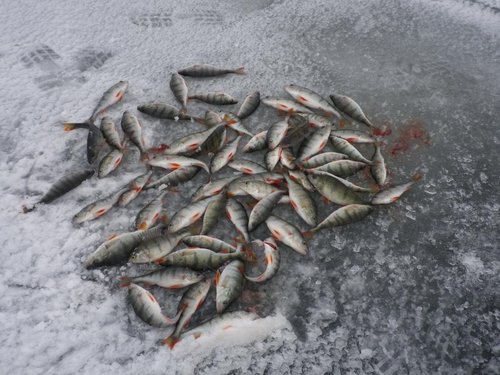 С утра дул приличный ветерок, поэтому, изменив своей долголетней практике мормышничанья, решил испытать свои таланты по рыбалке на блесенку. Самая первая же лунка за пол-часа принесла полтора десятка хорошеньких окуньков. Короче, блиткование в этот день меня зацепило по-хорошему, да и на мотыля компаньоны полавливали без особой эйфории. Ходил и осваивал новый для себя способ рыбалки до обеда, пока клев не стих совсем. Лишь после 14 впервые взял в руки мормышку и мотыльков, чтобы не забыть как трясти. С учетом жесткой фильтрации улова по минимальному размеру за день я надергал 4,5 кг, а компаньоны от 5 до 10кг.