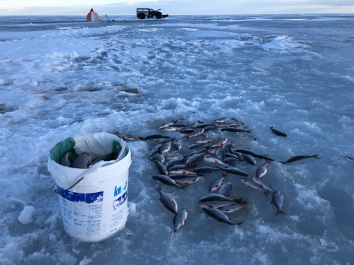 Я же продолжал бегать по трём самым перспективным лункам и получать кайф от скоростного подъёма рыбы. Клёв был бешеный! Дуплеты перестал считать после третьего подряд, их было действительно много! Снасти, подвергаясь нещадным нагрузкам, работали на износ, но тем не менее продолжали исправно поднимать одну рыбу за другой.