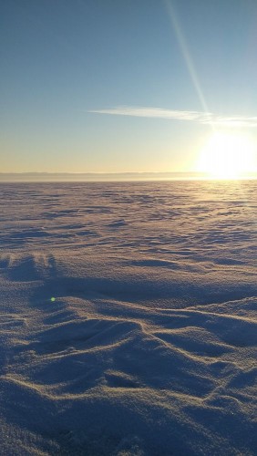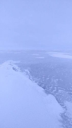С утра небольшой морозец, ветерок, чуть-чуть осадков и отличный ход. На удивление, промёрзшие сугробы на льду сохранились, хотя и уменьшились в размерах.