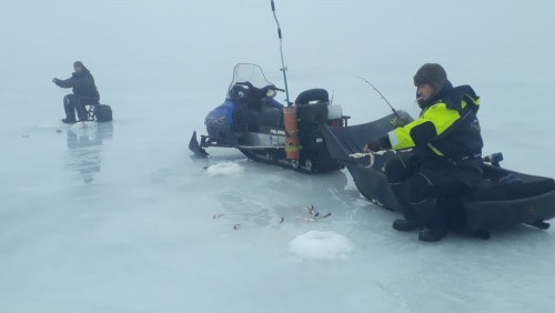 Решил с утра начать ловить по трещине , клевало ,но размер не радовал , перемещался , сверлил и при очередном перемещении проваливаюсь , скорость не большая снежик не успевает выскочить , лыжи на твердом льду , жопа по сидушку в воде , хорошо второй лед , но правда глубина по колено , чую сам то куй вытащу ,собрался уже Янке звонить ,а тут как раз вдоль трещины, квадрик с прицепо едет , ну тормознулись , выдернули , спасибо им большое , в благодарность вывез их на точку где мы ловили .