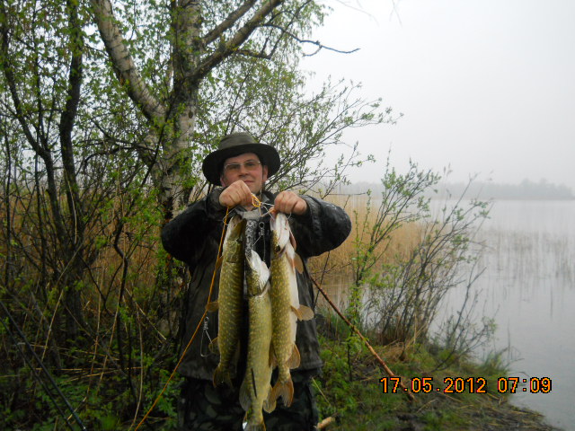 нашел практически сразу-поймал 4шт и все отпустил,всетаки искал стоянку крупной....К 7 утра нашел где она пасется...И тут пошел дождь,не просто дождь,ливень...Куртку с гортекса пробило буквально через 10мин.И в этот ливень случился выход крупной щуки.Поймал 4шт,пару сошло.....Так как промок уже изрядно,да и выполнение нормы вылова было налицо-пошли домой. По дороге одна резвая щучка сумела освободиться и ушла с кукана....У Игоря,на черных камнях, 1 щука,у меня 3, самая большая-3,6кг,остальные поменьше.