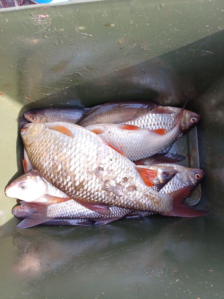 Всем привет. Езды мне до этой даже и не речки наверное, канавки скорее, минут 10 15. Народу много, но место найти можно. Приезжаем сюда за красноперкой, даже скорее краснопером. Клюет весело, но блин не у всех, надо знать как и где ее драконить. И тогда на заброс, сопротивляется задорно, бойко, а что еще надо. Размер разный, берем от 200 гр примерно, остальное в воду. Самая пока 750 гр, 400 500 довольно много иногда набегает.
