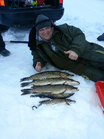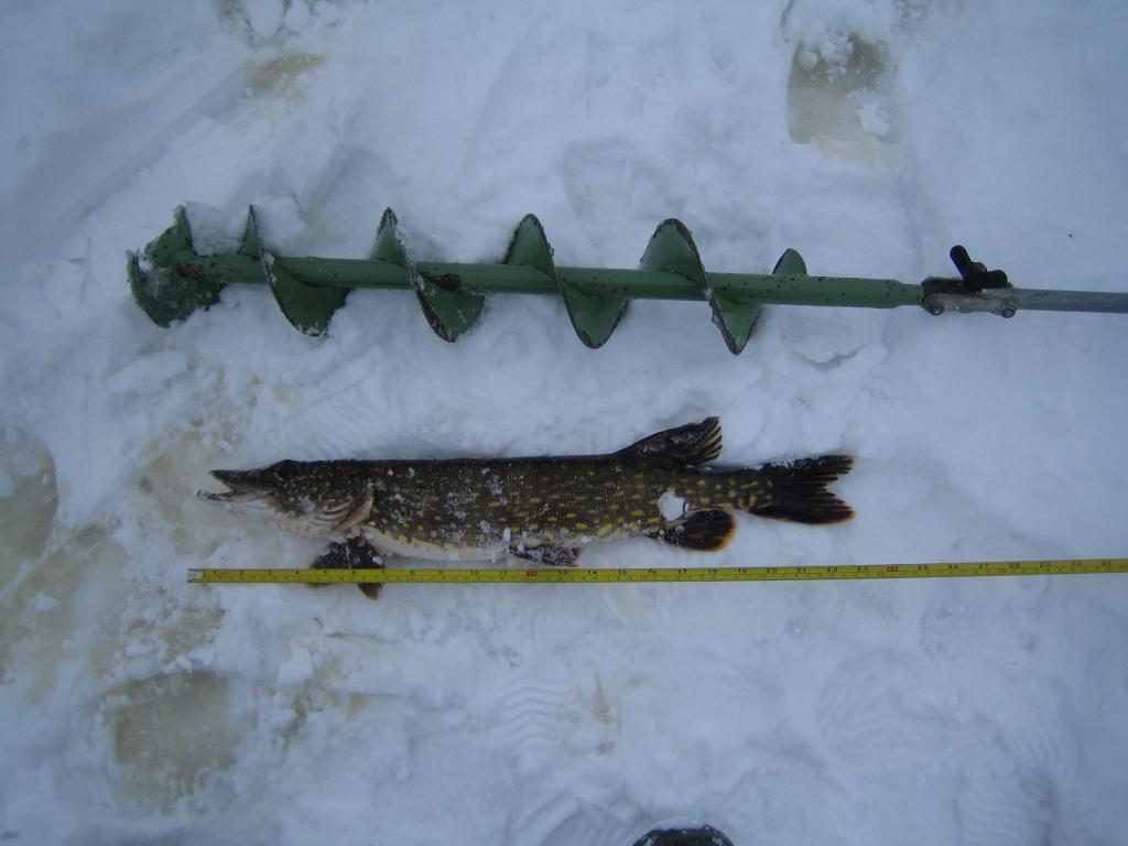 – собрались с товарищем – разбурили очередной плацдарм – попили чайку ,подкрепились и вперед – за щукой. На 3-й лунке получаю приятный удар – рыбка на том конце заходила подо льдом – держу, пытаюсь завести в лунку – есть ! килошная щучка. Минут через 10 на соседней лунке снова удар и щучка чуть поменьше первой уже на льду. Продолжаем рыбачить – щелк – поворачиваю голову на звук и вижу, как мой товарищ борется с кем-то. Подбегаю с крюком – но уже не надо – щука 1.650 уже на льду – правда удочку сломала зубастая.Ну на этом клев и закончился – погуляли мы еще по озеру – посверлили лунок – но более никто не позарился на наши приманки.