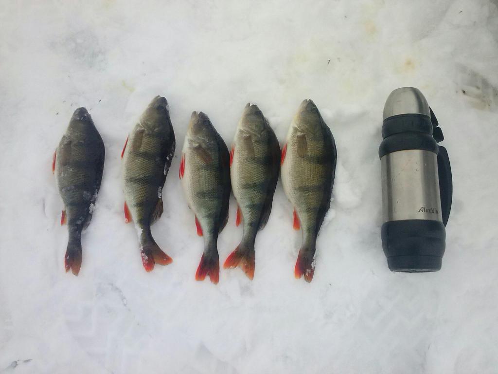 Первого красавца поймал я на балансир , потом товарищ двух подряд с одной лунки, затихло опустил мормышку – есть – на 0.12 приятно тащить – товарищ помог в лунке. На этом и закончилось – местный ушел домой – мы отправились на поиски. Посетили противоположный берег, вернулись на утренние лунки – разделились – я остался – товарищ ушел на глубину. Нашел две мели и искал самое глубокое место между ними – когда позвонил товарищ – говорит - я тут четырех, нет уже пятерых взял… Так быстро по озеру я давно не перемещался. Подойдя к товарищу увидел картину маслом – пять полукилограммовых окуней лежали возле лунки.
