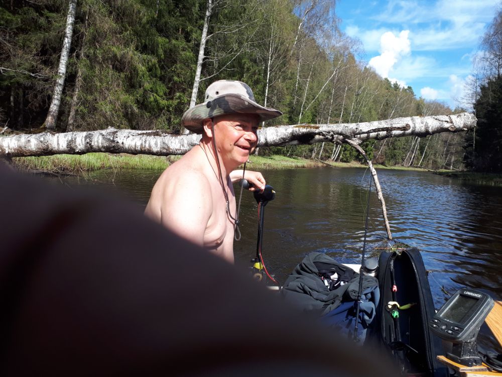 Маршрут тоже намечен,так-что в путь. Вода за неделю упала сантиметров на 30, обнажились коряги,стала подниматься трава. Кое-где пришлось проталкиваться, примотали изолентой фиксатор у моторчика,чтобы при наезде на бревно откидывался,а то пошлый раз подломили транец чуток. Вот почему бы с завода не предусмотреть такую функцию?
