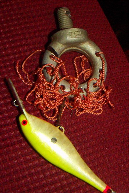 Вот мой вариант отцепа для воблерков. Долго подбирал , но один спец подсказал. Нужно взять кусок хорошей, крепкой веревки на которой должны быть закреплены два карабина(крепеж). Один карабин служит для скольжения по основной леске с зацепившейся приманкой, к другому карабину прикреплена гирька грам 500 из свинца и кусок бредня из толстых капроновых ниток в виде квадрата(на вид как мантия прикрепленная к гире). Вот и получается, когда воблер зацепился намертво, и вы знаете, что шнур не выдержит на разрыв прикрепляете это дело к основной леске на свободный карабин и эта мотня летит к приманке. Когда чувствуешь, что свинцовая гирька дошла до приманки начинаешь делать небольшие поднимающие движения. Это для того чтобы крючки запутались в капроновой сетке. Уверяю вы это почувствуете. Дальше дело техники, т.к нагрузка ляжет на веревку а не на шнур.