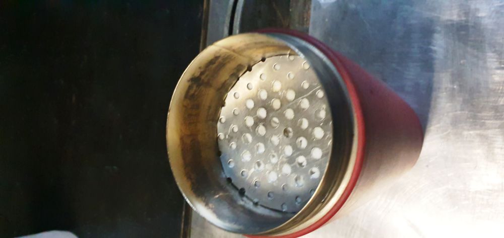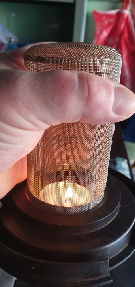Банку из под конфет DROPS я переделал, убрал верх, натолкал биокаминной ваты и поставил сетку из нержавейки,