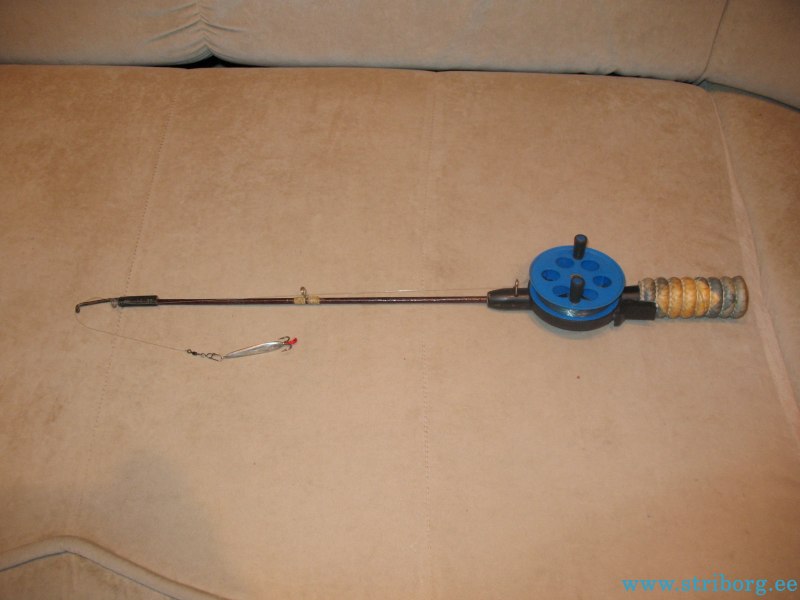 Понравилась большим диаметром катушки. Перед первым забросом приходилось вытягивать леску, заодно проверяя её на прочность. Операция очень важная, после неё частенько перевязывал карабинчик. Хлыстик поставил другой, самодельный из хлыстика советских 10-ти рублёвых телескопов, отпилив толстую часть см. 40. Кивок из пружинки от сальника с припаянными колечками. Ручку обклеил старым ковриком из ванной. Получилось довольно комфортно и тепло держать удочку. Леска сальмо 0,27 айс. Легкая и удобная. Вот.