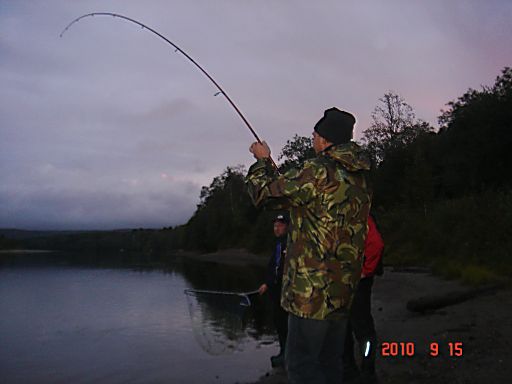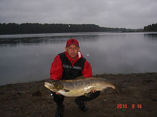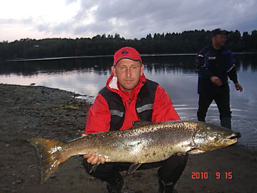 На следующий день погода была лососевая: сильный ветер и дождь и вся наша команда обрыбилась. Пять рыбин весом от 7 до 12 кг взяли с собой, несколько отпустили с миром. Были и поклевки, закончившиеся обрывами лески. После поклевки приходится очень потрудиться, чтобы довести рыбку до берега. Адреналин хлещет через край.... Мощь рыбы, да на течении просто поражает.