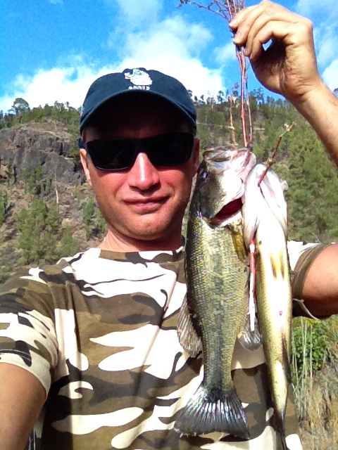 Проехав чуть далее мы остановились на площадке, с которой шла тропа вниз ущелья к озеру. Время позволяло и мы решили спуститься. Я разложил снасть, проверил глубину, насадил кукурузу и закинул удочку. Мои тем временем достали айпад и принялись смотреть мультики. Через три минуты последовала поклевка и я вытащил свой улов, это был маленький басс (как я узнал после). Хищник на кукурузу???!!! Точно как наш окунь, только без полос, полностью светло зеленый кроме брюха конечно. Рыбка была маленькая, но это тоже трофей, поэтому радовался я как ребёнок. Через пять минут последовала еще поклёвка и тут я почувствовал борьбу сильной рыбы, я решил что теперь то точно карп. Но опять это был басс, теперь только уже солидного размера под кило. Теперь восторг был уже и у моих зрителей. Началась поспешная фотосессия. Но я решил, что для хорошего фото надо помыть рыбу от береговой грязи, что было большой ошибкой, “хорошего фото” сделать не удалось, рыба вырвалась у меня из рук. Уже вечерело и мы решили вернутся. Солнце в горах садится очень быстро и обратный подъём был уже в полной темноте. Весь последующий вечер я вспоминал как басс облапошив меня ушел восвояси. Но была сделана очень важная заметка, при вытаскивании снасти маленькие бассы жадно бросались на кукурузу. Это меня сильно подогревало к реваншу. Через день я вернулся в торговый центр с желанием купить блесен. Показав рыбу на фото, я спросил у продавца совет по блесне, на что мне объяснили, что местные ловят басса на кукурузу и личинку какой то мухи. Но это меня никак не успокаивало. Основной выбор блесен был для морской рыбалки и ничего, что меня самого привлекало я не видел. Я взял единственный очень маленький воблер и еще пару блесен, которые на мой взгляд могли бы привлечь басса. Вернувшись на озеро, с первого заброса на маленький воблер, который закинуть моей снастью было сложно и тонул очень мало, я подсек маленько басса. Дело пошло, подумал я. Поймав еще несколько бассов незачетного размера, я попробовал все остальные блесны. Интересовал рыбу только воблер. Я огрузил насадку грузиками выше по леске. Дальность заброса чуть возросла, но оглубляемость существенно изменилась. Теперь я стал ждать поклевки зачетной рыбы. Но поклевок больше не было, такое ощущение, что рыба уже уколотая, поняла уловку и приманкой больше не интересовалась. Я решил оставить именно этот воблер в качестве приманки и проверить еще доступные места выхода к воде, так как из за растительности или крутого берега это не везде можно было сделать. Выйдя на плес я увидел зачетного басса плавающего на поверхности, который выйдя из под укрытия веток кустов вышел меня оценить, немного покружил и плавно ушел восвояси. Закинуть в эту заводь я не рискнул в виду присутствия кустов вокруг, побоявшись потерять единственную рабочую приманку. Надо отметить, что каждый раз как я выходил к берегу, маленькие бассы сразу собирались с разных сторон посмотреть на меня и потусовавшись чуть, расходились. Рыба очень активная и периодически были слышны всплески от попыток поймать какое нибудь насекомое с поверхности. Потихоньку я освоил навыки ловли бассов и начал ловить зачетные экземпляры. Итогом дня стала поимка 7 крупных бассов примерно по кило (маленьких я не считал), из которых двух я взял на домой на ужин и одного “карася”, я так и не узнал н