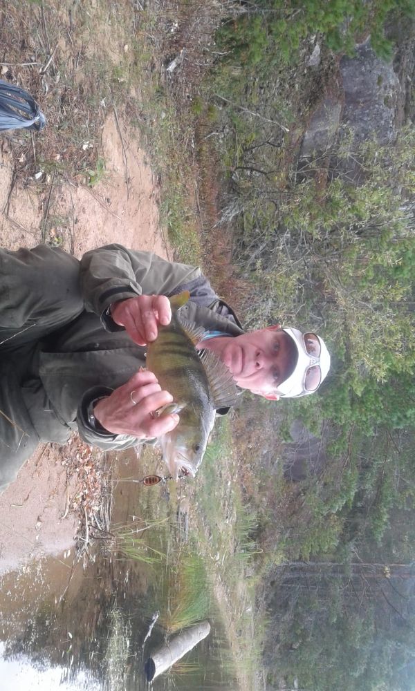 Показали мне тут сегодня несколько озерков в лесу. Типа карьеров. Съездили со знакомым, он с удочкой а я со спином. Клевал средне мелкий полосатый, потом при очередной смене места с первого заброса вертушки кто-то мощно её скушал, при вываживании тряся башкой. Вода очень чистая, когда увидел кто там, офигел слегка. :D В течении пяти минут припарковал ещё двух, поменьше. :beach: :soHappy: