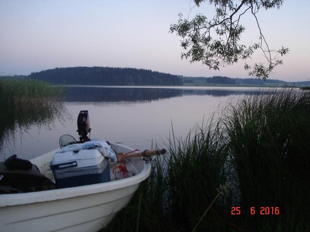 Ночевал в лодке знакомого обычной гребной, постелив пенку и спальником укрывшись - было тепло, не смотря на усилившийся с ночи северяк. Стоял на якоре в метре от берега - меньше комариков. Спал часа три, заиППала кукушка куковать всю ночь - в 3 утра проснулся... и сам себе сказал КУКУ, БАЛЯ! Кофе на газовой минигорелке и через ровно две минуты уже на точке.