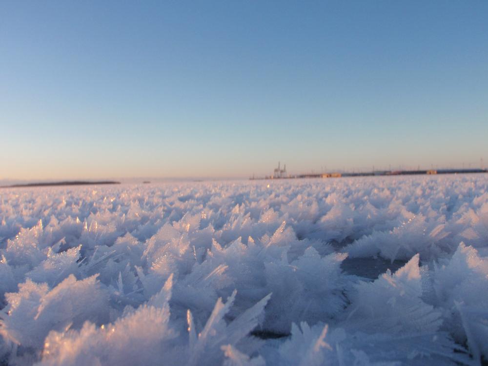 Сегодня решился выползти на залив так как морозы стояли знатные. Лёд 4-5 см,мороз -24. Ловил исключительно на блесну но за 3 часа ни одной поклёвки. За то красиво!
